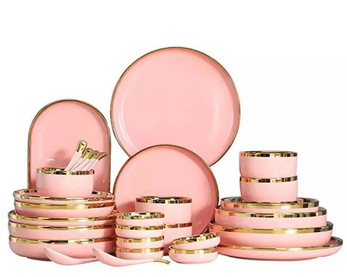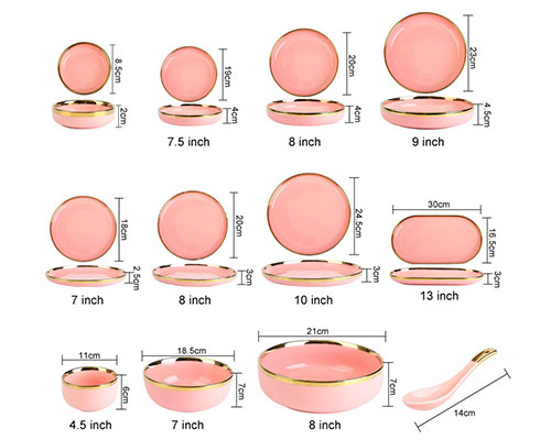 Pink Ceramic Plates are certified quality ceramic tableware. Lead-free and cadmium-free, healthy and environmentally friendly. All ceramic plates and bowls are plated with luxurious wide gold rims for a high profile elegance. The flat base is easy to store and highly stackable for easy pairing with other tableware.