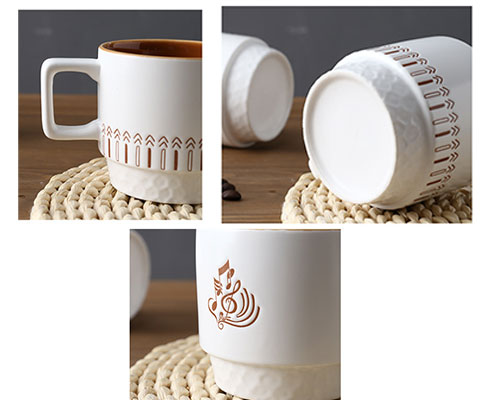 The modern ceramic coffee mugs have smaller bottom than top, making it easy to stack them together. Easy-to-stack ceramic coffee mugs save space and keep your cabinets clutter-free. This white ceramic mug holds 320ml of coffee. The exquisite patterns on the cups are hand-painted, with a bumpy texture, and not easy to fade.